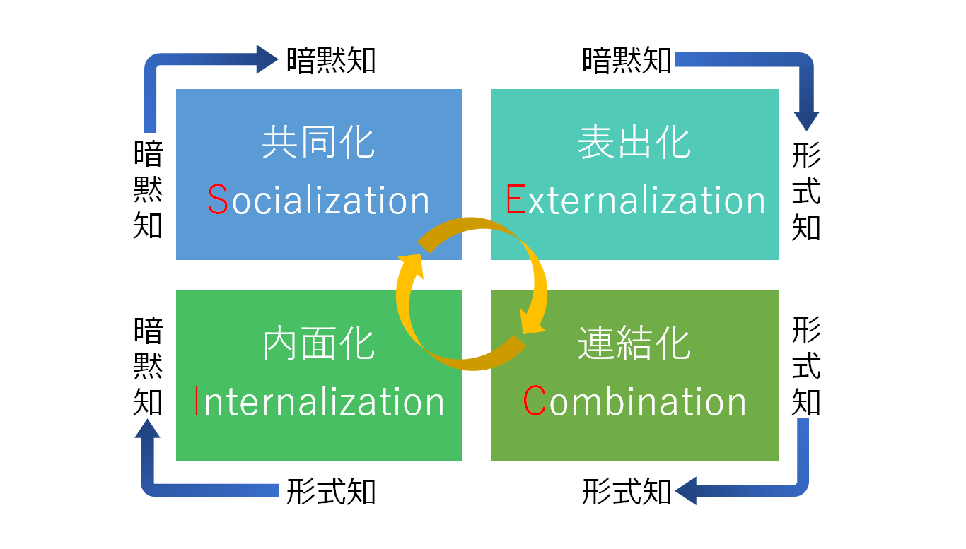 共同化(Socialization)/表出化(Externalization)/連結化(Combination)/内面化(Internalization)の頭文字です。
